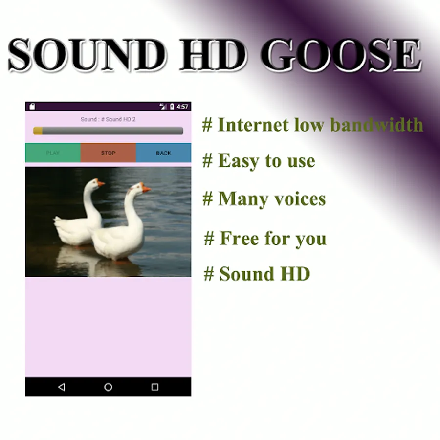 The gooseberry app has included the most geese sound so that you can use it to bring up the sound of the goose no more or less. The app is very easy to use. It's even possible to make a screen saver.