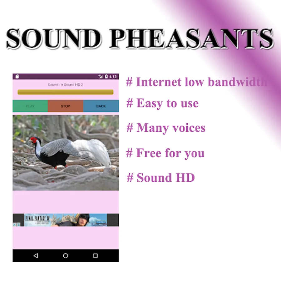 Pheasant is a beautiful and colorful chicken. Popular people to play. People who are interested in finding out may have to go to the chicken. By bringing another chickens to call. Which is not easy to use, so pheasant phonetically, so it is with the pheasant phonetic mp3 to the mobile. You go to Pheasant just bring this app. When the target area is opened, open it. Speaker mobile as loud as possible. Pick the pheasant sound you want and turn it on and wait a moment. Pheasant's goal is to imagine that. The same will come out.