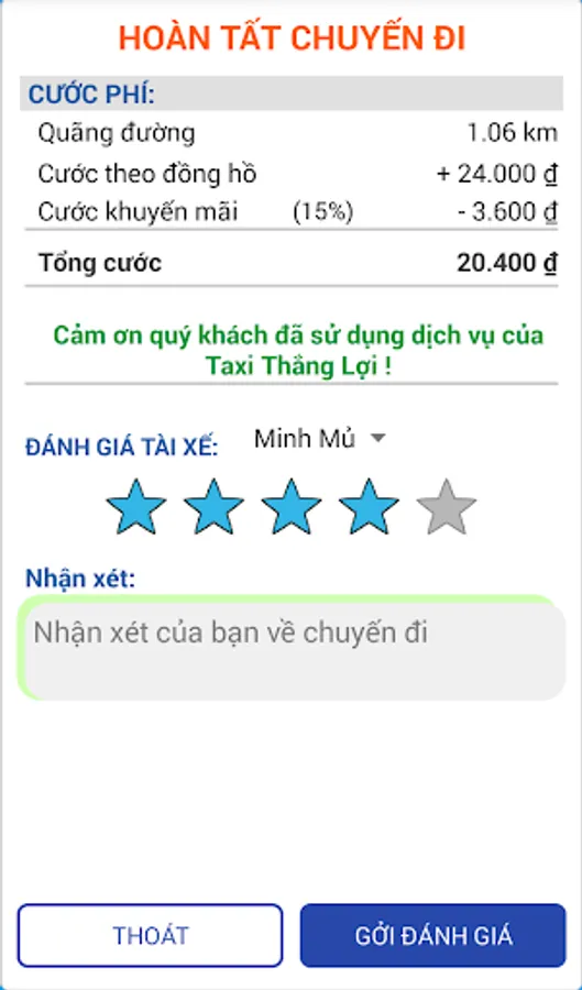 * Provide information upon completion of the trip: the distance, metered charges, the amount of discounts (promotion), payment amount