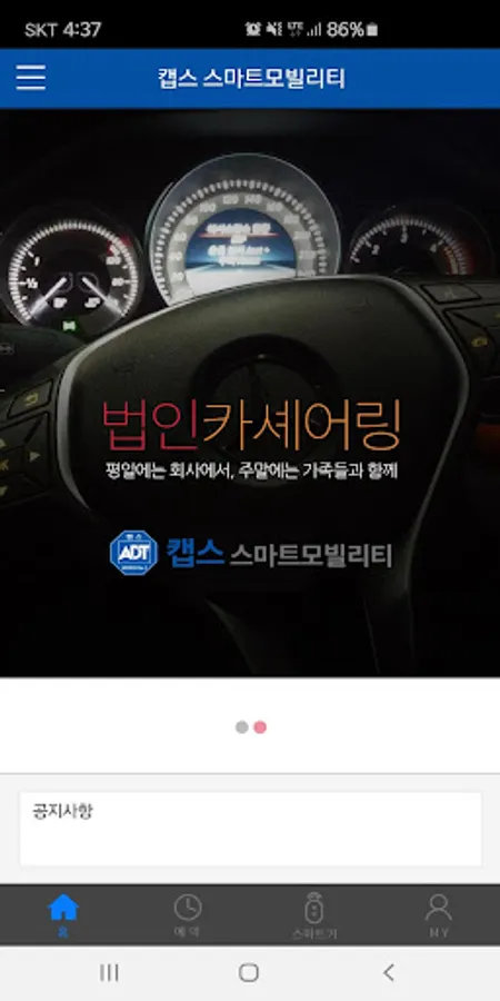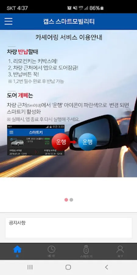 Smart Mobility Car Sharing is a dedicated service for corporate vehicles that can use both reservation control and car sharing services for corporate vehicles. You can use the industry's first car-sharing service that can automate corporate vehicle management and even provide vehicle sharing between members.