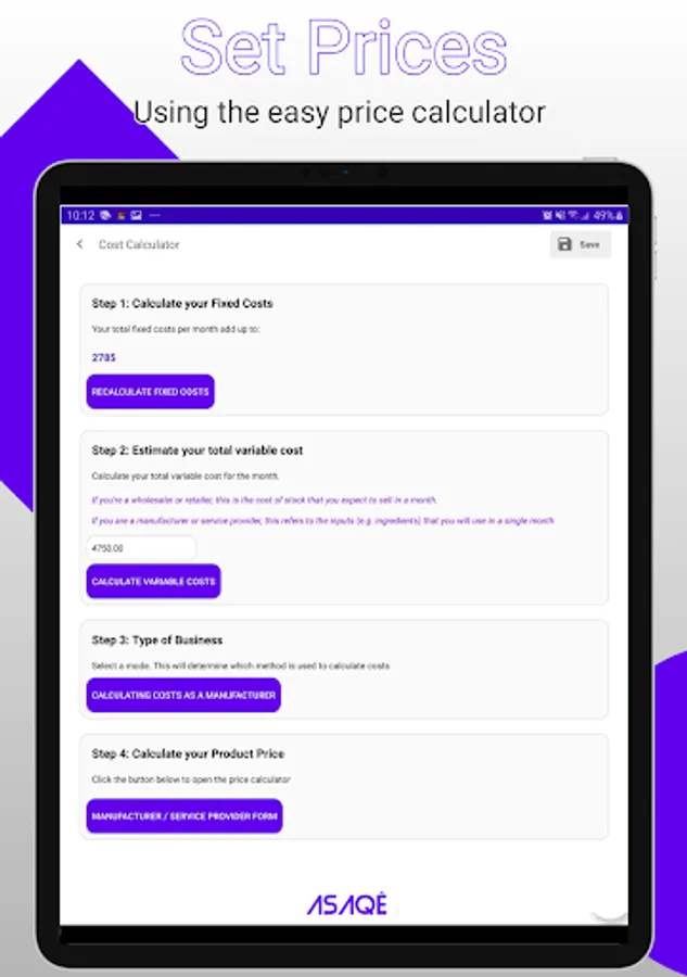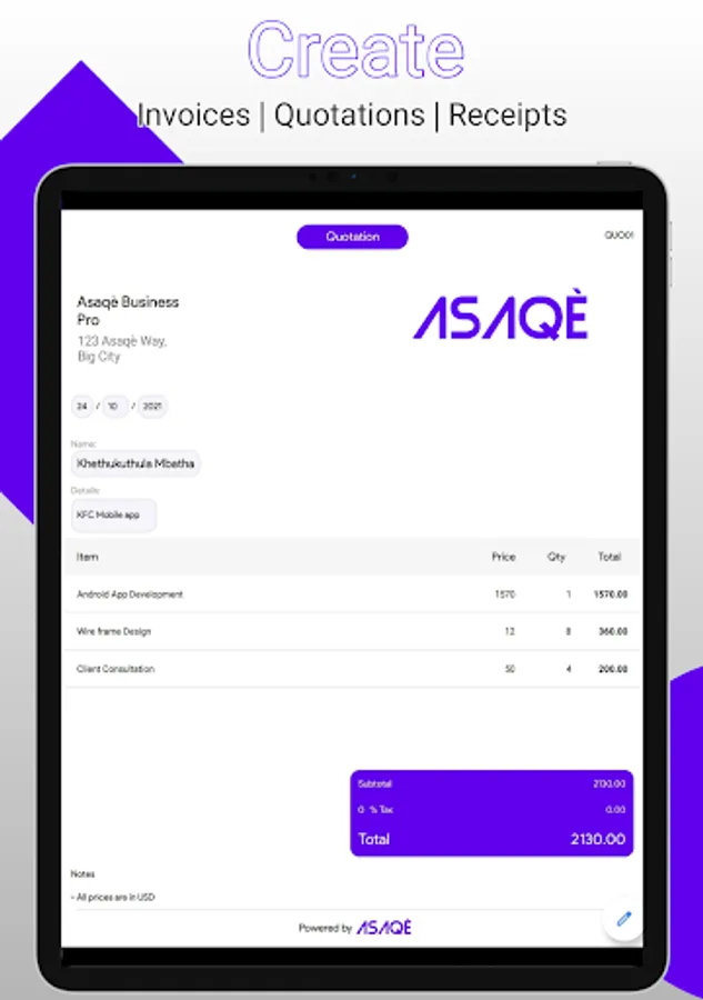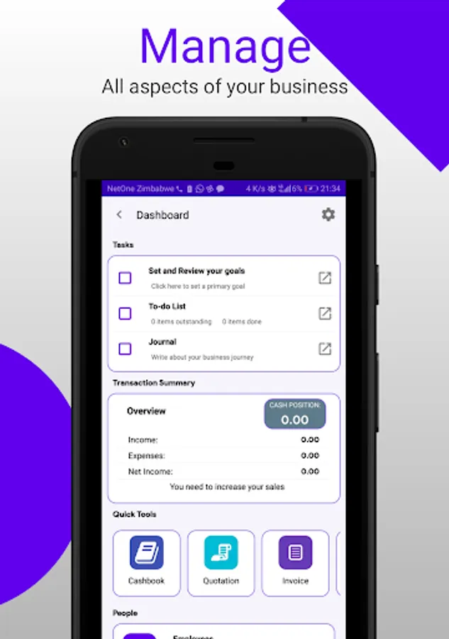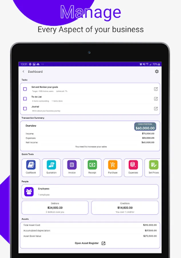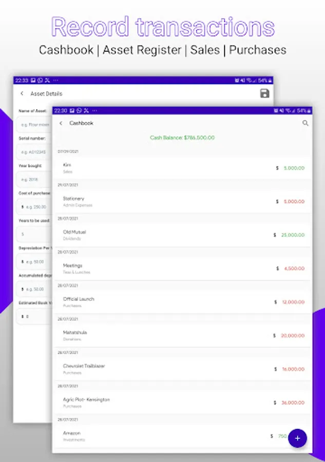 Record income and expenses in your cashbook and track your balance. As your business starts to grow, Asaqè Business Pro will help you keep track of your performance by allowing you to record transactions, create quotations, invoices and receipts. It also allows you to monitor asset value using a simple asset register.