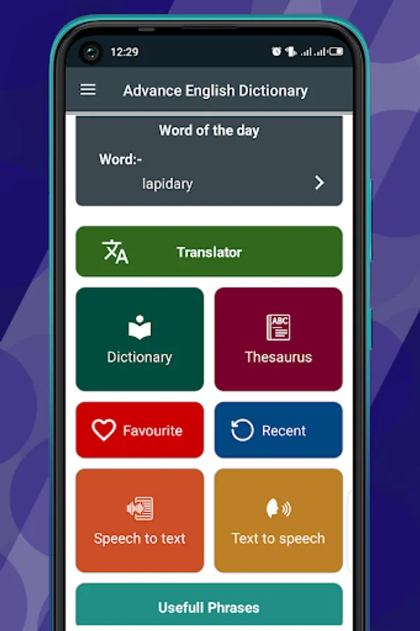 This is the main object of this Application that contains words and their meanings as well as synonyms. Dictionary contains over 500,000+ words and their meanings. There is a search button inside a dictionary so that you can search for any word easily also there is a speaker button so that you can search for any word by speaking too in Advanced English Dictionary.