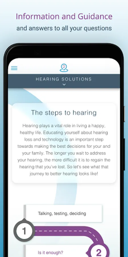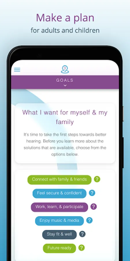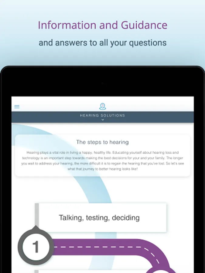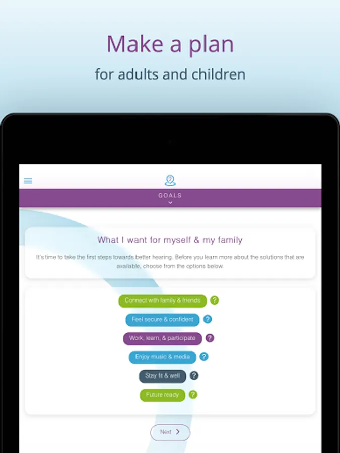 The app will help you and your loved ones to choose the best possible hearing solution, based not only on the level of the hearing loss, but on your needs, wishes and dreams for the future as well. It will help you set goals, track progress and connect you to resources and information to help you to take control of hearing.