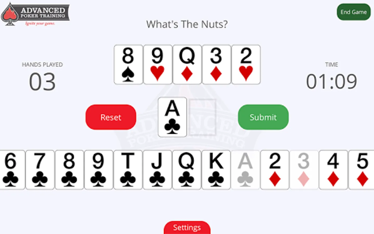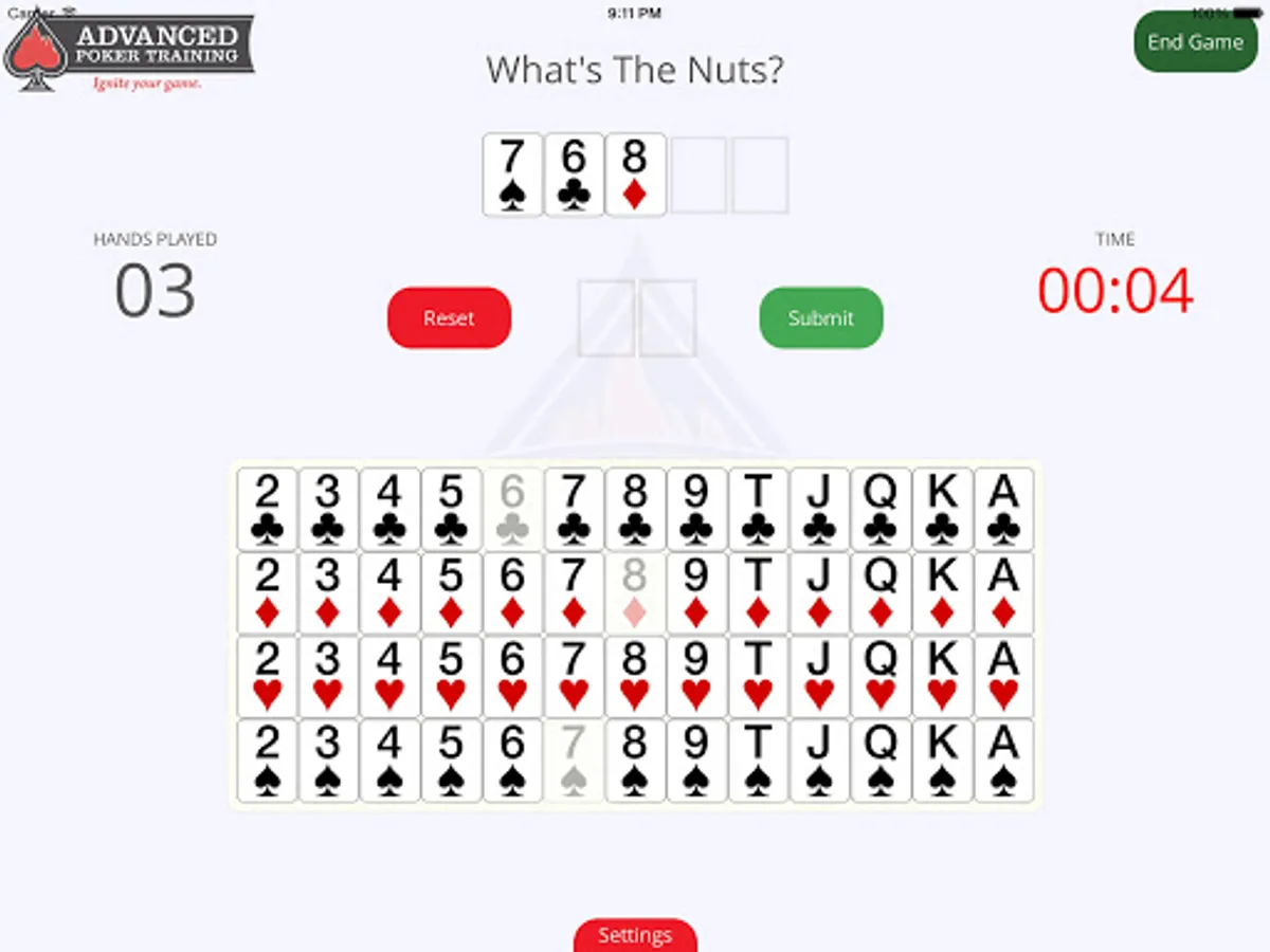 AdvancedPokerTraining.com, the world’s #1 poker training site, has developed the new “What’s the Nuts?” training game to help poker players improve their accuracy and speed in assessing the nuts.