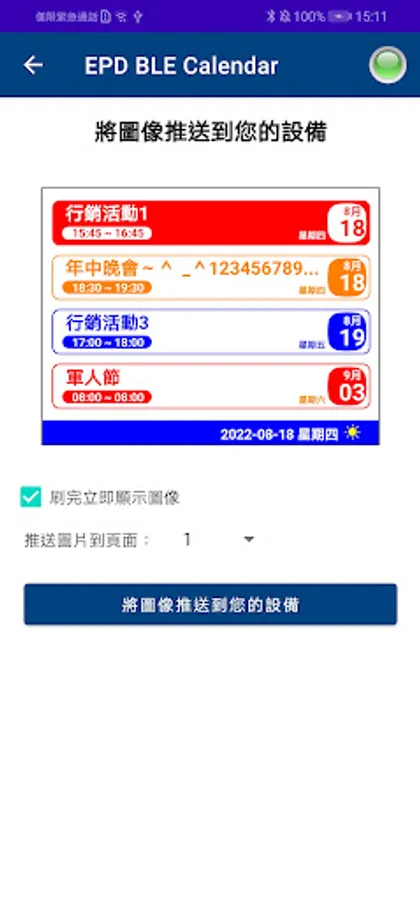 This is a bluetooth tool program produced by Advantech, which can be used with electronic paper produced by Advantech (models: EPD-250, EPD-252, EPD-353) to read the activities or events of the Google Calendar in the mobile phone, and transmit them through the Bluetooth of the mobile phone. way to transfer images to electronic paper applications.