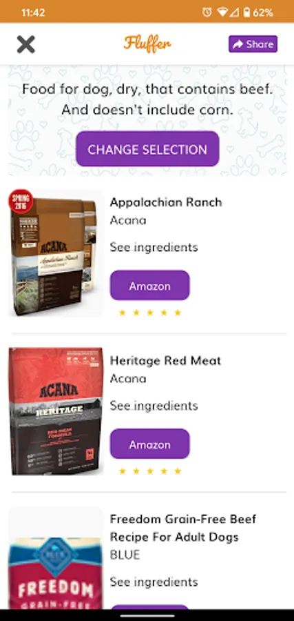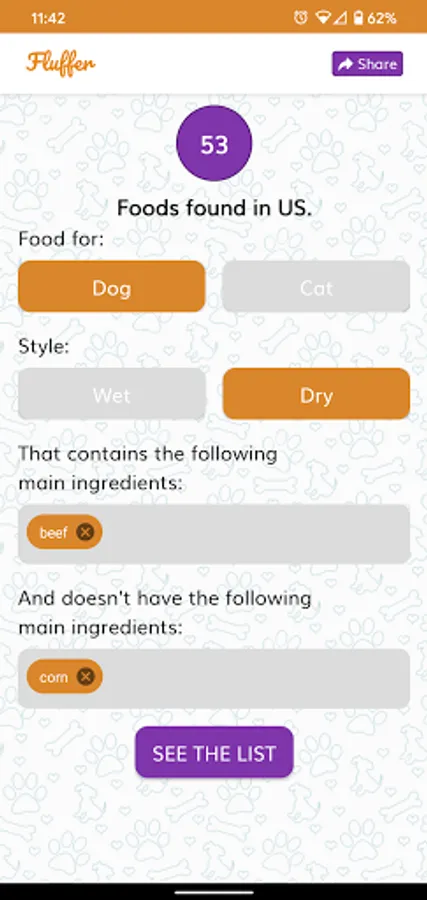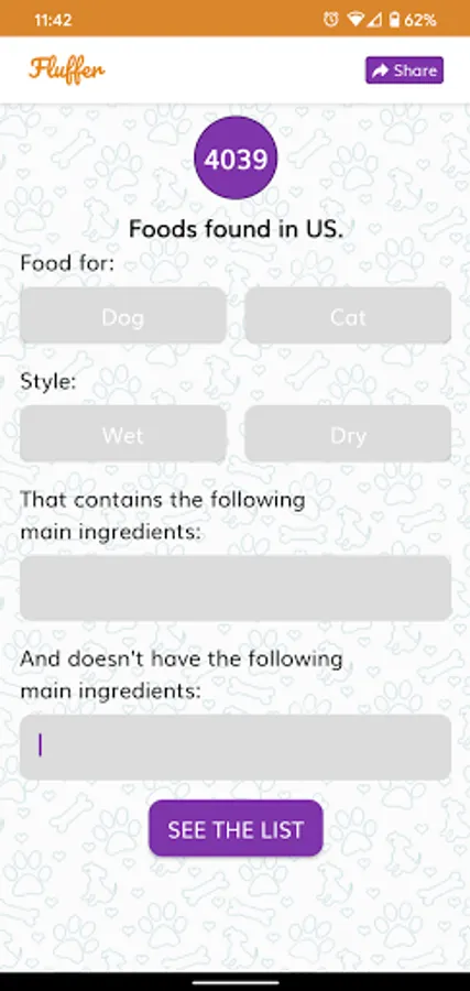 Our application is connected to one of the biggest pet food databases, and allows you to filter by the ingredients you don't want in your dog's or cat's food, making it easier for you to discard the ones with undesired fillers.