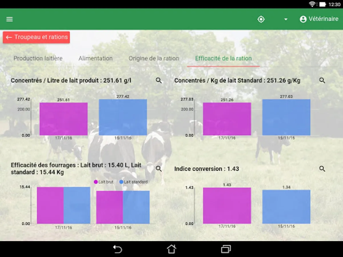 Vet'mobile is the application that innovates the veterinary management in dairy herds: dynamic management of monitoring reproduction, qualitative and quantitative analysis of milk production and follow-up of the ration performance.