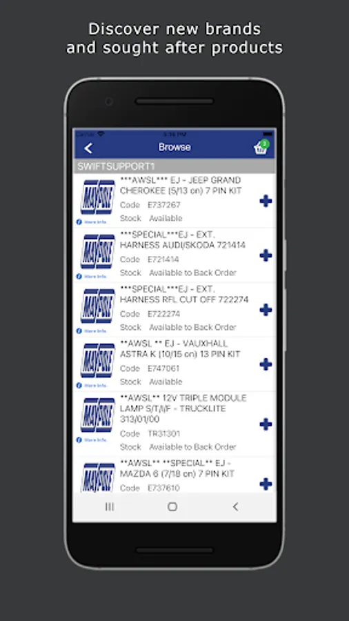 Once registered, you can browse our product listings or search for products by product code, by description or by scanning a barcode with your device’s camera. Quickly and easily browse our stocklist availability, place orders and receive special promotions and discounts, all from your smartphone or tablet.