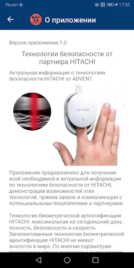 The application is designed to receive all the necessary and relevant information on security technologies from HITACHI, demonstrate the capabilities of these technologies, receive applications and communicate with potential buyers and partners.