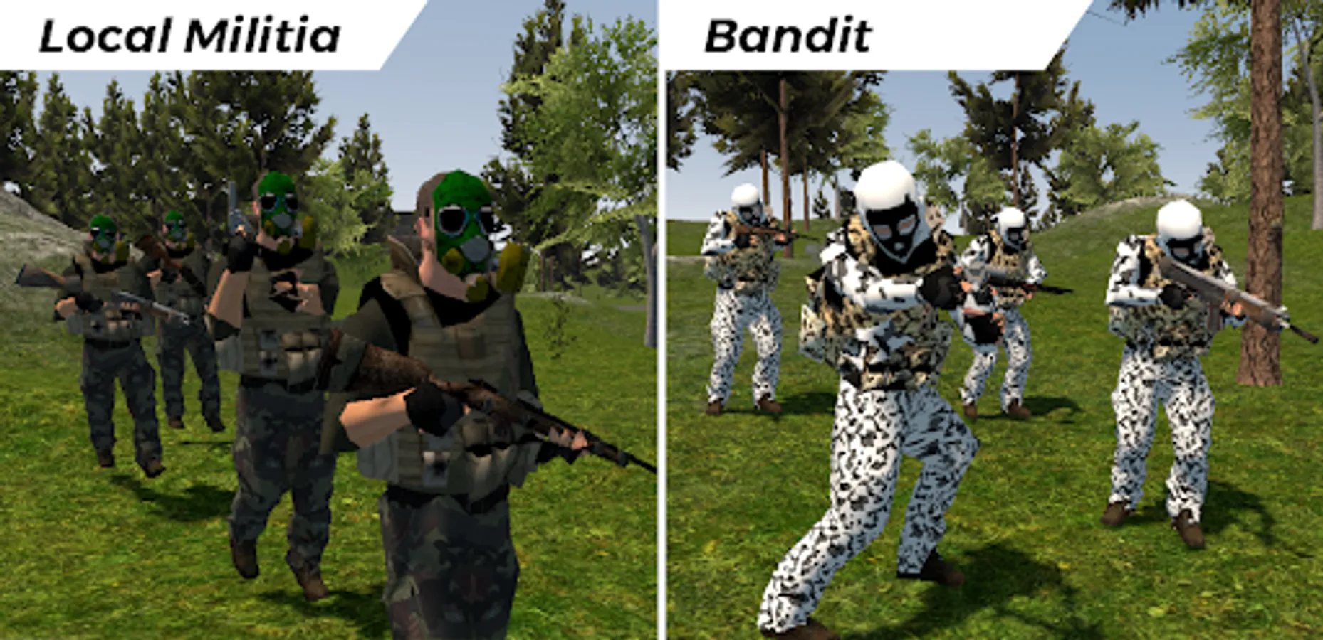 Currently there are 2 factions : militia and bandit. Bandit will shoot you on sight. Militia will shoot you if you harm them. Their soldier will roam across the map. You may find some of them simply patrolling, fighting monster and fighting each other.
