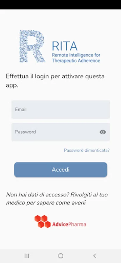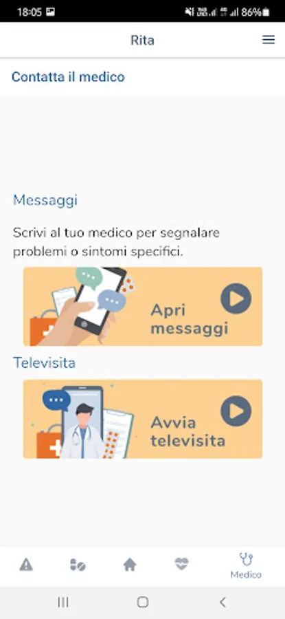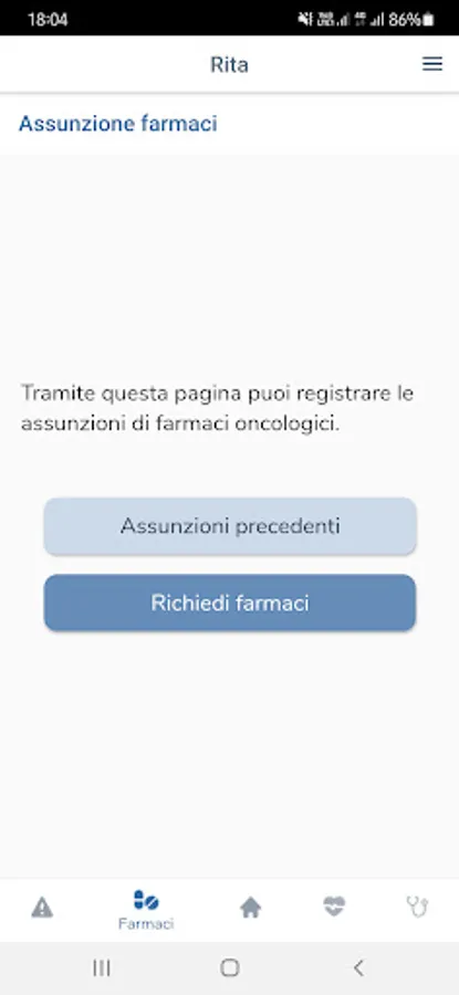 The main purpose of the RITA (Remote Intelligence for Therapeutic Adherence) app is to improve the clinical efficiency and management of haematological and cancer patients treated on an outpatient basis as it allows not only a telemedicine visit, but also the support of the patient in the daily management of the disease and related disorders, as well as treatments and their complications. The RITA communication platform is able to support the patient, the caregiver, the doctor and the general practitioner in the management of the disease and its treatments.