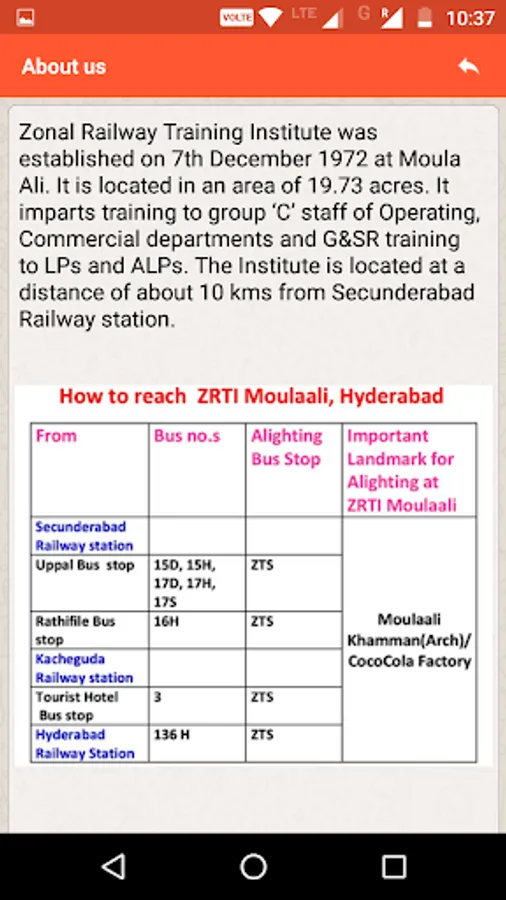 Zonal Railway Training Institute was established on 7th December 1972 at Moula Ali. It is located in an area of 19.73 acres . It imparts training to group 'C' staff of operating , Commercial departments and G&SR training to LPs and ALPs . The institute is located at a distance of about 10 kilometers from Secunderabad Railway station