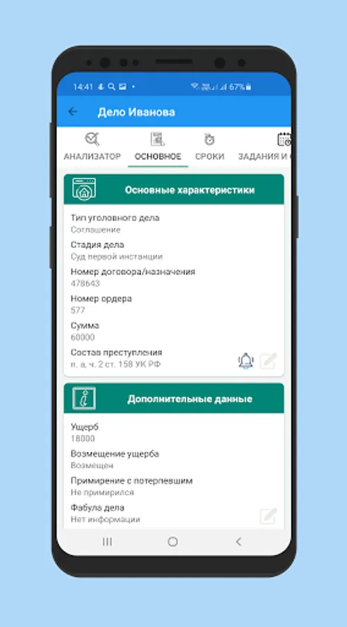 • Analyze criminal and civil cases - that is, get court practice in one click. The system will find "fresh" sentences that are most similar in parameters to your case and will provide the result of the analysis in the form of possible outcomes in the case