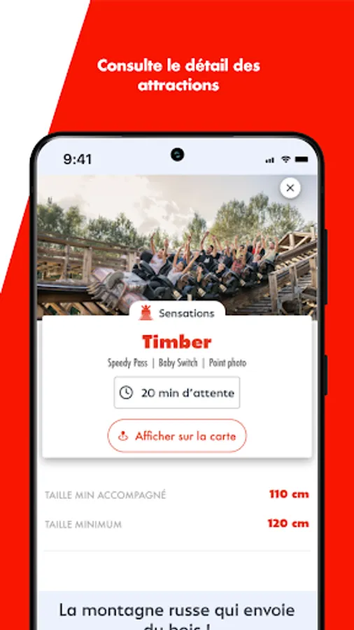 The application Walibi Rhône -Alpes allows you to know in real time the waiting time of the main attractions of the park. Wherever you are in the park, you have access to this valuable information.