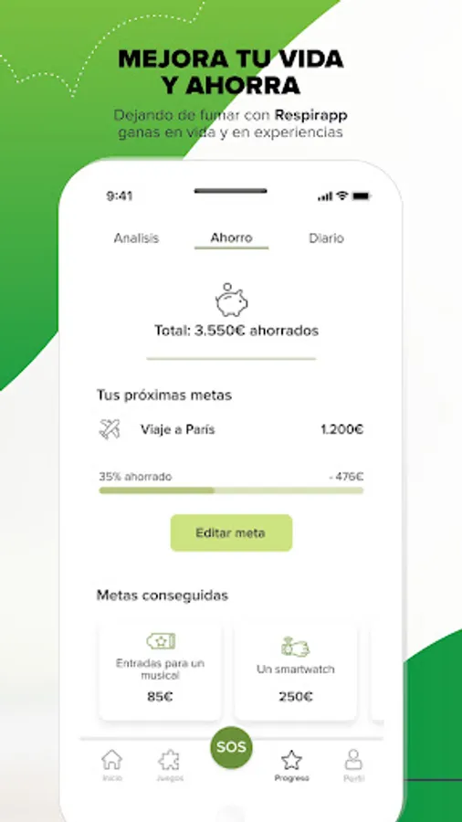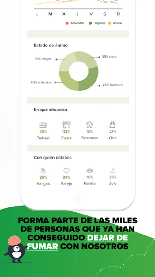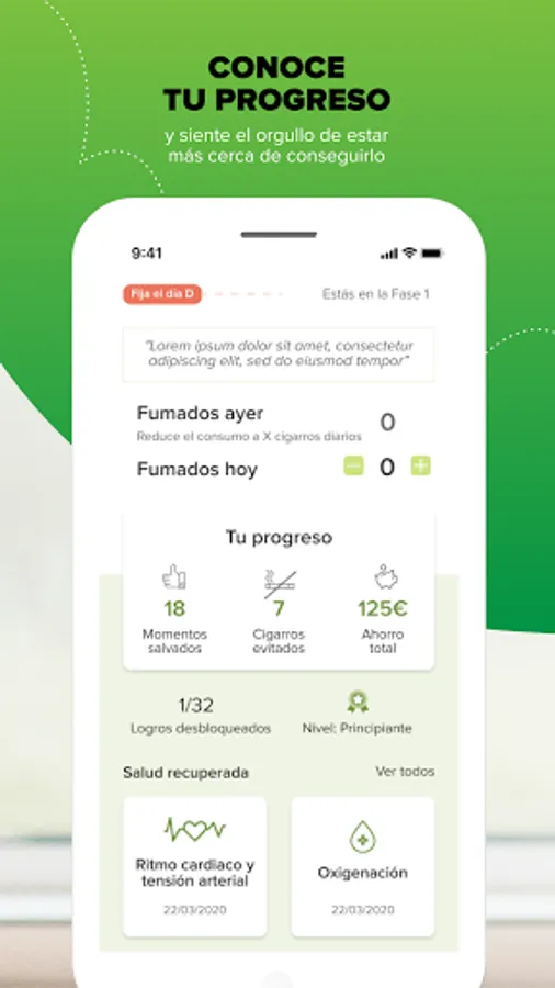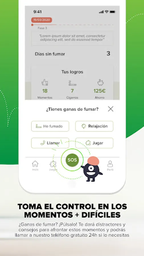 With a profile customized to the experience of each user, with help sections to reduce anxiety, relax, avoid the urge to smoke, prevent relapses, etc. and notifications encouragement and information about your progress.