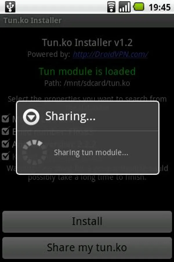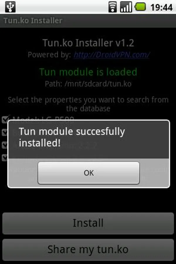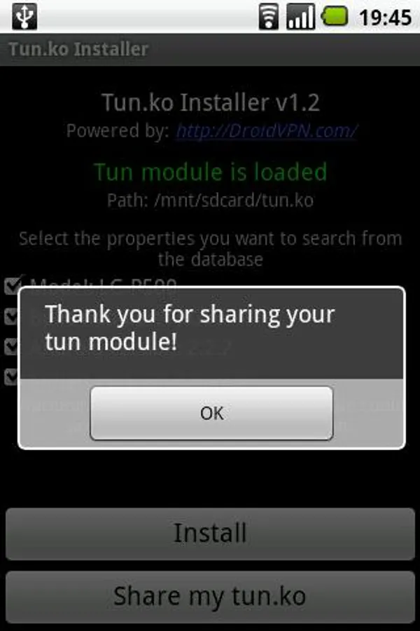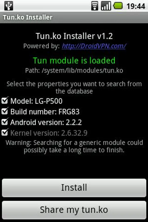 Your phone's model, kernel and build number should match for the module to work. Even if you find your phone in our list it doesn't guarantee that it will work it just raises the possibility that it will be able to find a compatible module. DO NOT ASK IN THE COMMENTS TO FIX THE APP SINCE THERE IS NOTHING WRONG WITH THE APP. IT SIMPLY MEANS THAT THERE IS NO TUN.KO FOR YOUR PHONE OR THE ONE IN OUR DATABASE IS INCOMPATIBLE WITH YOUR PHONE.