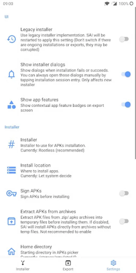 SAI can install apps using standard Android API, using root access or using Shizuku.