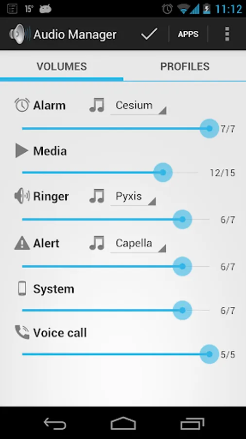 * Adjust Alarm, Media, Ringer, Alert (or Notification), System and Voice call volumes level.