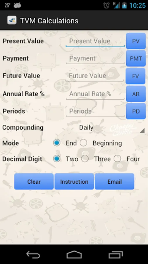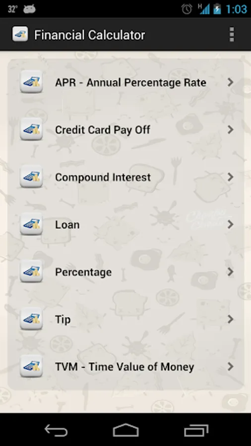 Application consist of many simple yet accurate financial calculators. Try *FINANCIAL CALCULATORS PRO by AeH Ideos* for additional features and ad free experience.