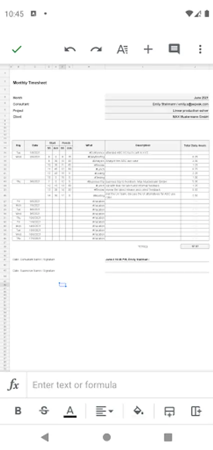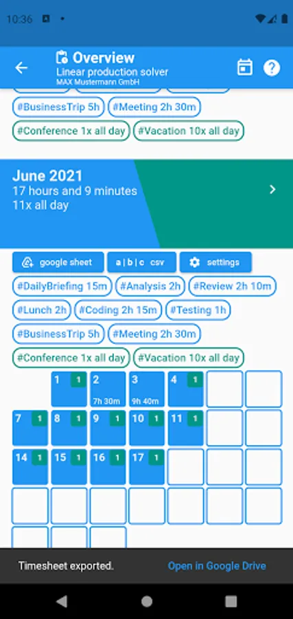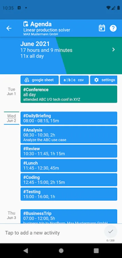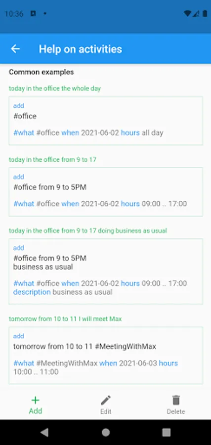 Arbeitszeit application supports an informal way to input your daily activities, e.g.: