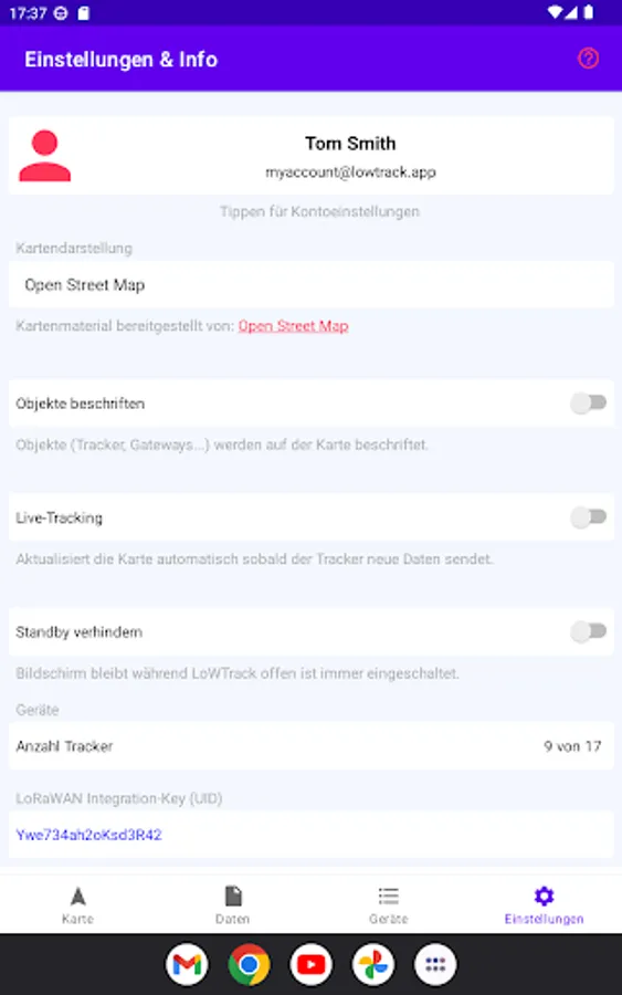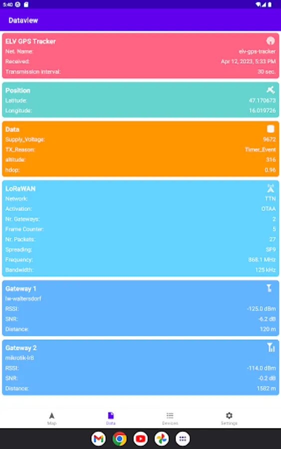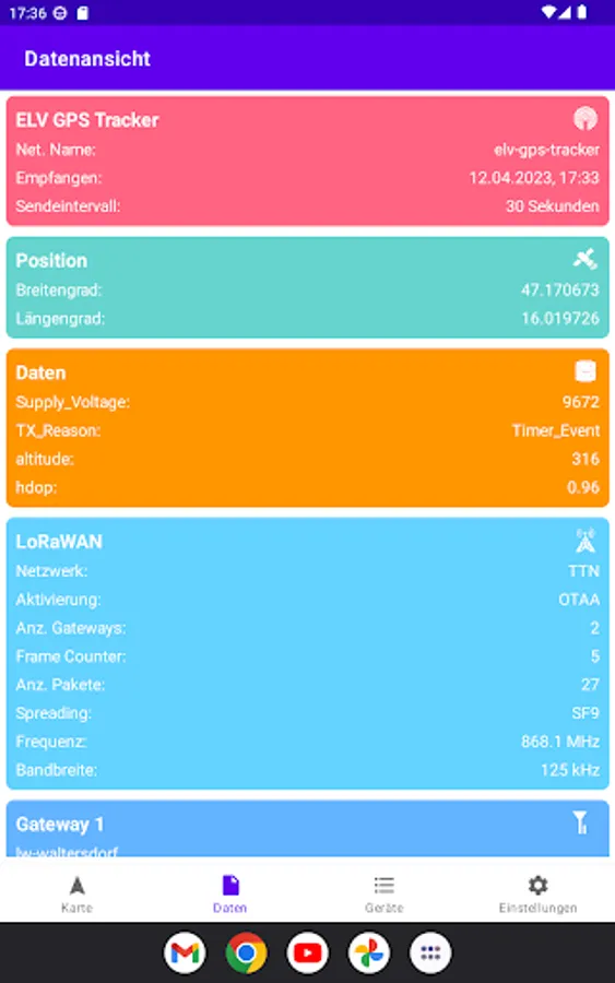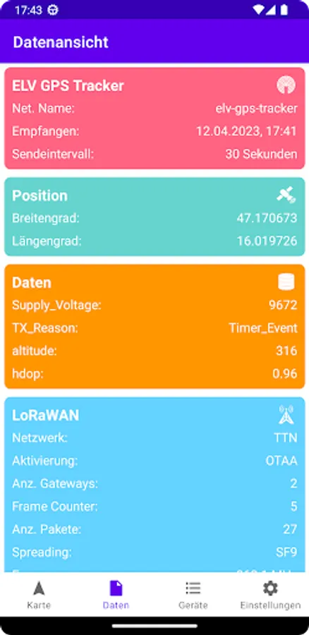 LoWTrack shows you the current position of your LoRaWAN GPS trackers and gateways on a map. The app supports the LoRaWAN® networks TTN (The Things Network) and Helium. In addition to the position data, the app also displays numerous details about the local LoRaWAN® network. Optional payload parameters such as battery voltage, speed or ambient temperature from your tracker can be displayed in the app.