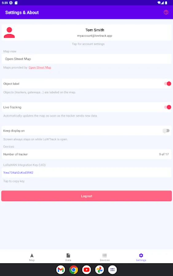 A free user account is required for this app. In order for your trackers to be used with LoWTrack, an appropriate interface must be set up between the LoRaWAN® network and LoWTrack (integration) and a payload formatter (decoder) must provide the position data as latitude (lat) and longitude (lon). See the LoWTrack manual for more setup information.