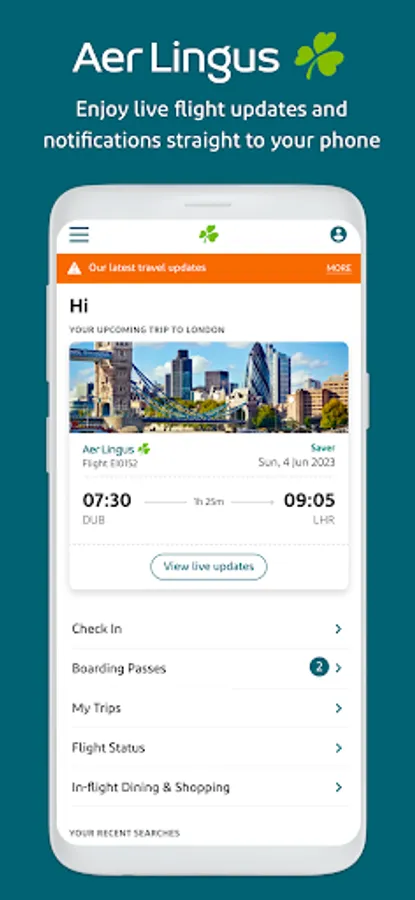 Download the Aer Lingus app to book, manage and check in for your trips. Access your boarding passes conveniently, stay in-the-know with live flight updates, enjoy AerClub rewards and more.
