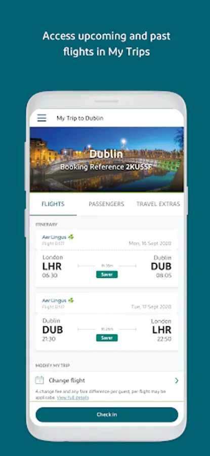 Keep track of your Aer Lingus flight bookings all in one place, under My Trips. View your upcoming trip details and itinerary, check in for your return trip, reserve a seat or even change your booking if you need to. Having the Aer Lingus app on your device is also a great way to keep informed with check in status, gate numbers and gate changes.