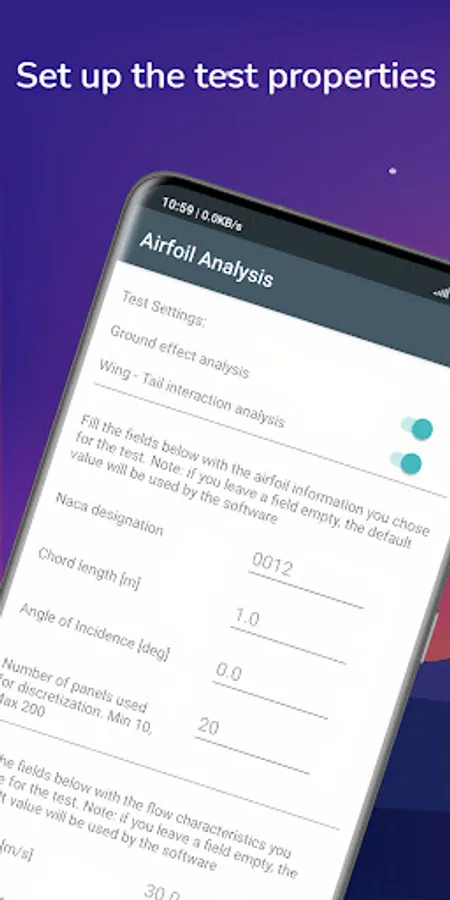 The analysis can be carried out for a single airfoil as well as considering the wing - tail interaction. In both cases, the ground effect condition may be taken into account.