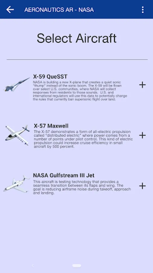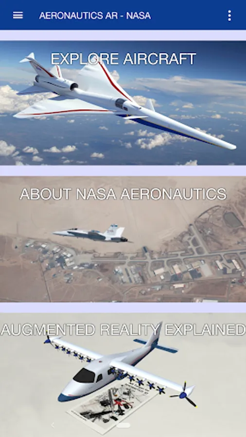 NASA Aeronautics AR is an augmented reality mobile app designed to educate people about NASA's X-planes and aviation research programs. The information presented here showcases some of the advancements and far-reaching impact that NASA has on the aviation industry. Using the mobile phone’s camera pointed at a flat surface, this app displays 3D models of current or future NASA research aircraft.