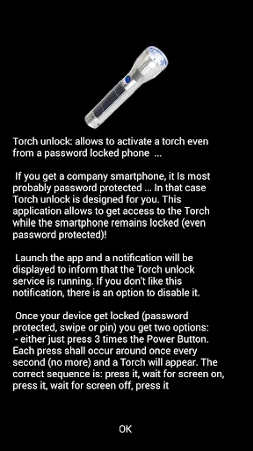 Note after having installed the application TorchUnlock Service will automatically be loaded if you reboot the device.