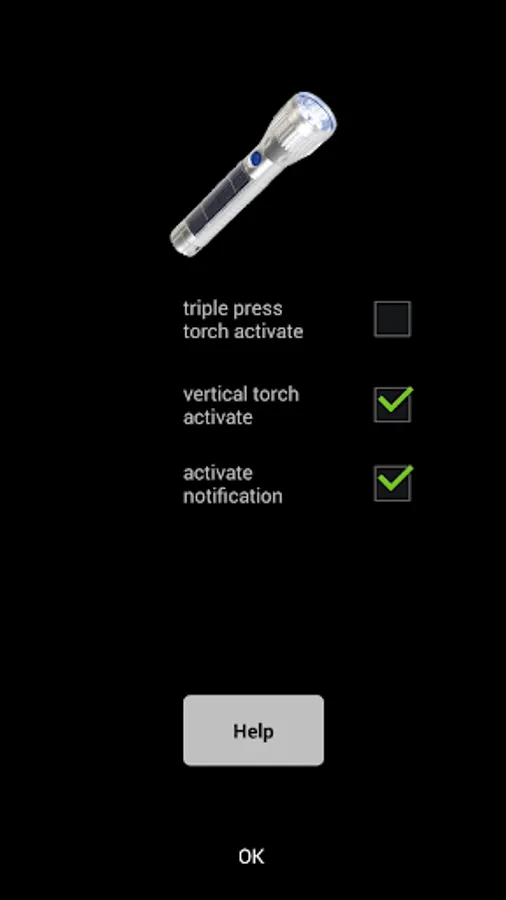 On splash screen you get the opportunity to activate/inhibit the background service, to choose your prefered activation method ("triple press" or "vertical") and also to show or not the Torch Unlock notification. When the notification is displayed, pressing it brings you to the Torch tool page.