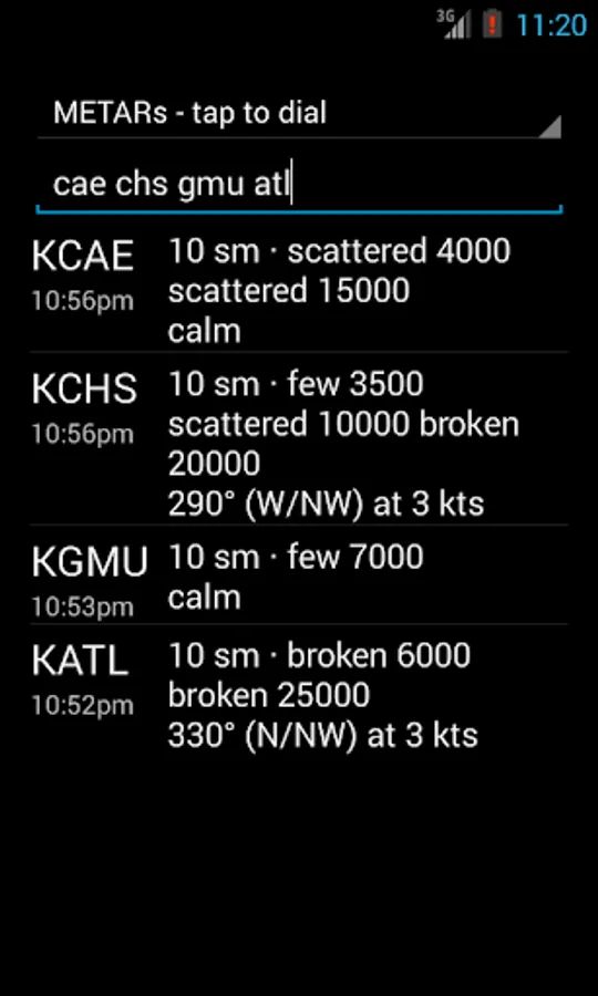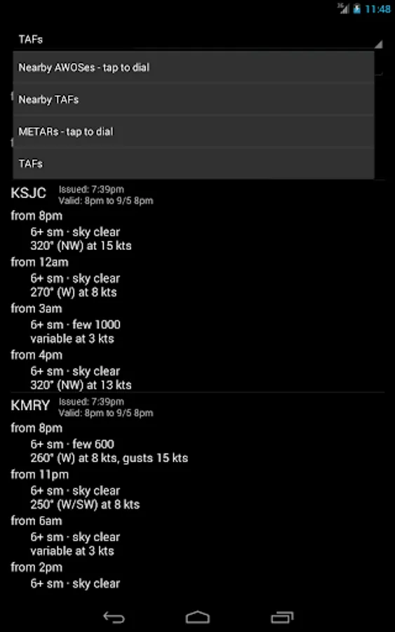 This application retrieves current METARs and Terminal Area Forecasts from the NOAA National Weather Service. It will use network location to identify nearby weather reports or you can specify airports directly. In additional, the application will dial the AWOS for any of the nearby METAR stations.