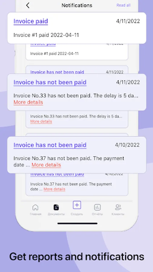 Automatic mailing of invoice reports - daily, weekly and monthly. The application also reminds you of delays and notifies you about the payment of your bills.