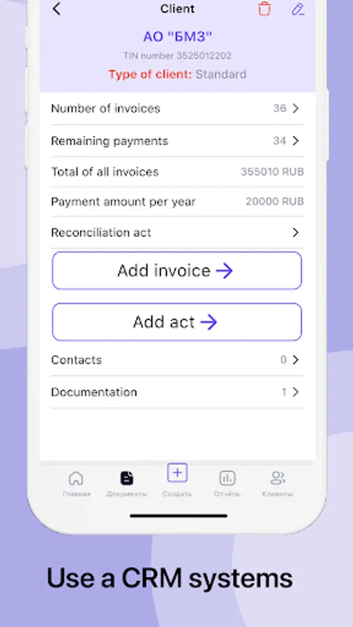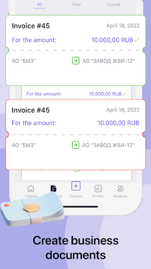 The app functions as a bills organizer. All created documents are stored here - invoices, VAT invoices, acts, receipt. Using the filter, you can quickly find the one you need to view, edit or delete. It is possible to convert any document to a new one - based on the invoice, you can create an act and vice versa. The application is created according to business practices and legal requirements to invoices and acts.