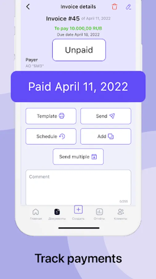 The app helps to create the necessary document in a few seconds without errors in accordance with the business document flow. After that, the only thing you have to do is to send it by email or in any of the messengers to your client directly from the application.
