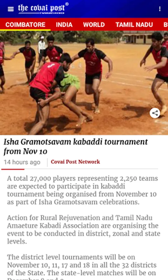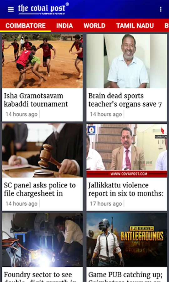 Coimbatore's first English news portal. Latest news in and around Coimbatore, Tamil Nadu and India are provided instantly online. Our state of the art mobile app will give you message in snippets. Coimbatore is one of the largest cities in the southern state of Tamil Nadu and plenty of interesting news on a daily basis will be available.