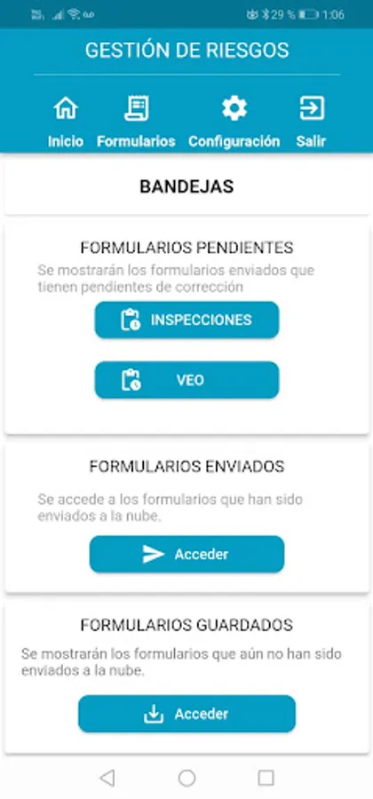 Information records are entered into the application without the need to be connected to the Internet. These collected data are later synchronized with a connection to a central server that consolidates the reports and facilitates the control and monitoring of risk activities in the unit.