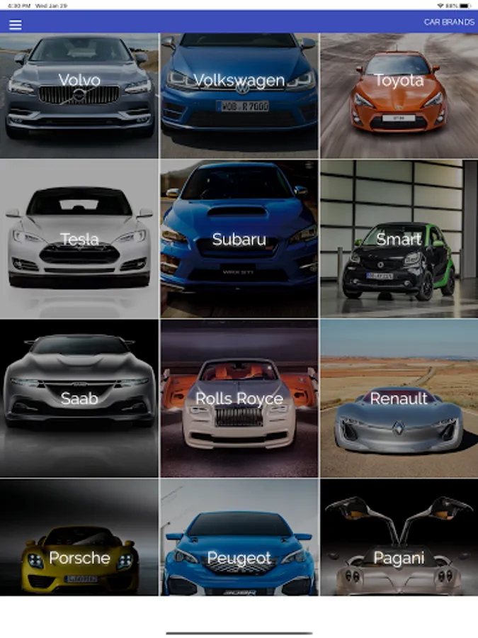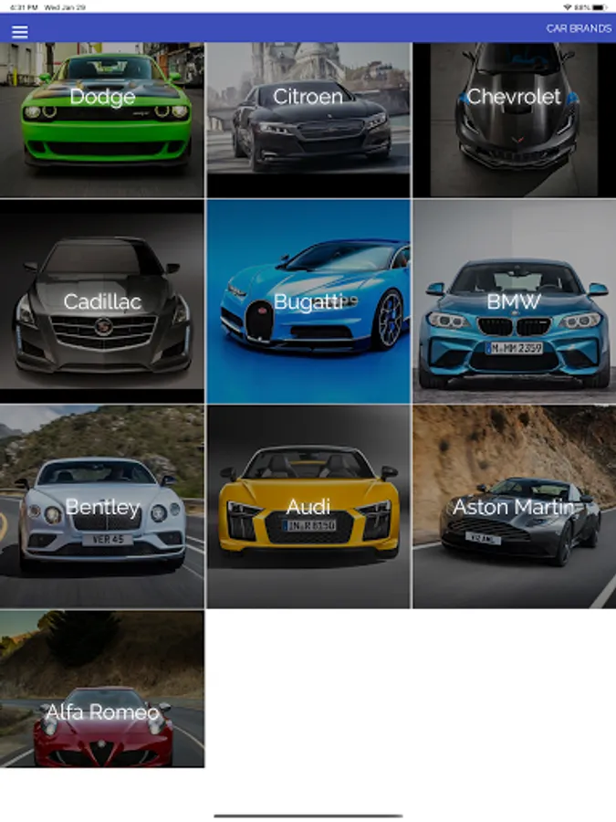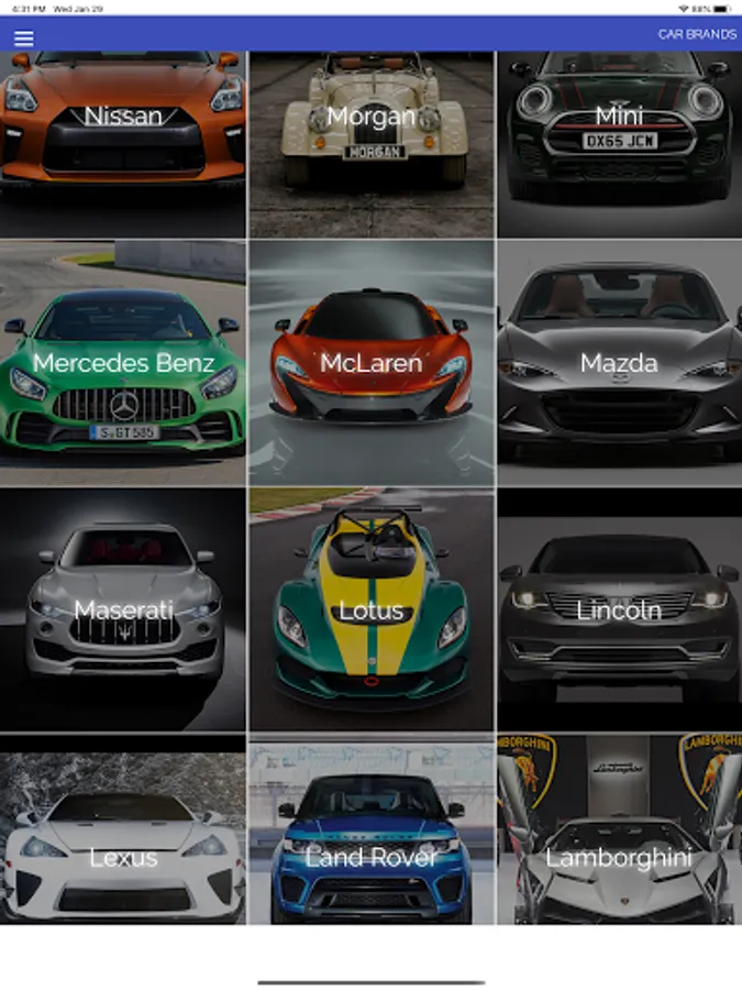 - Makes: Alfa Romeo, Aston Martin, Audi, Bentley, BMW, Bugatti, Cadillac, Chevrolet, Citroen, Dodge, Ferrari, Fiat, Ford, Honda, Infiniti, Jaguar, Jeep, Kia, Koenigsegg, Lambo, Land Rover, Lexus, Lincoln, Lotus, Maserati, Mazda, McLaren, Mercedes Benz, Mini, Morgan, Nissan, Pagani, Peugeot, Porsche, Renault, Rolls-Royce, Saab, Smart, Subaru, Tesla, Toyota, Volkswagen, Volvo