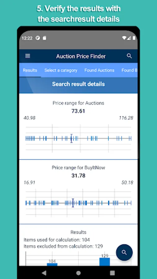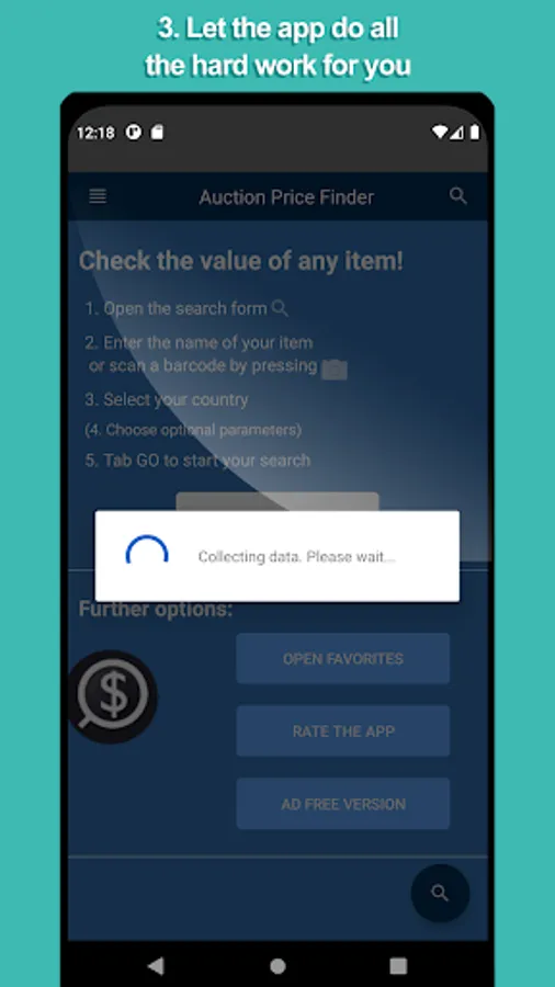 Just open the search form, enter the name of your item (or use the barcode scanner), select your country and tab GO. The auction price finder then checks the last sold items on ebay and calculates the average price for you.