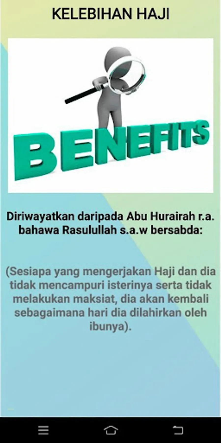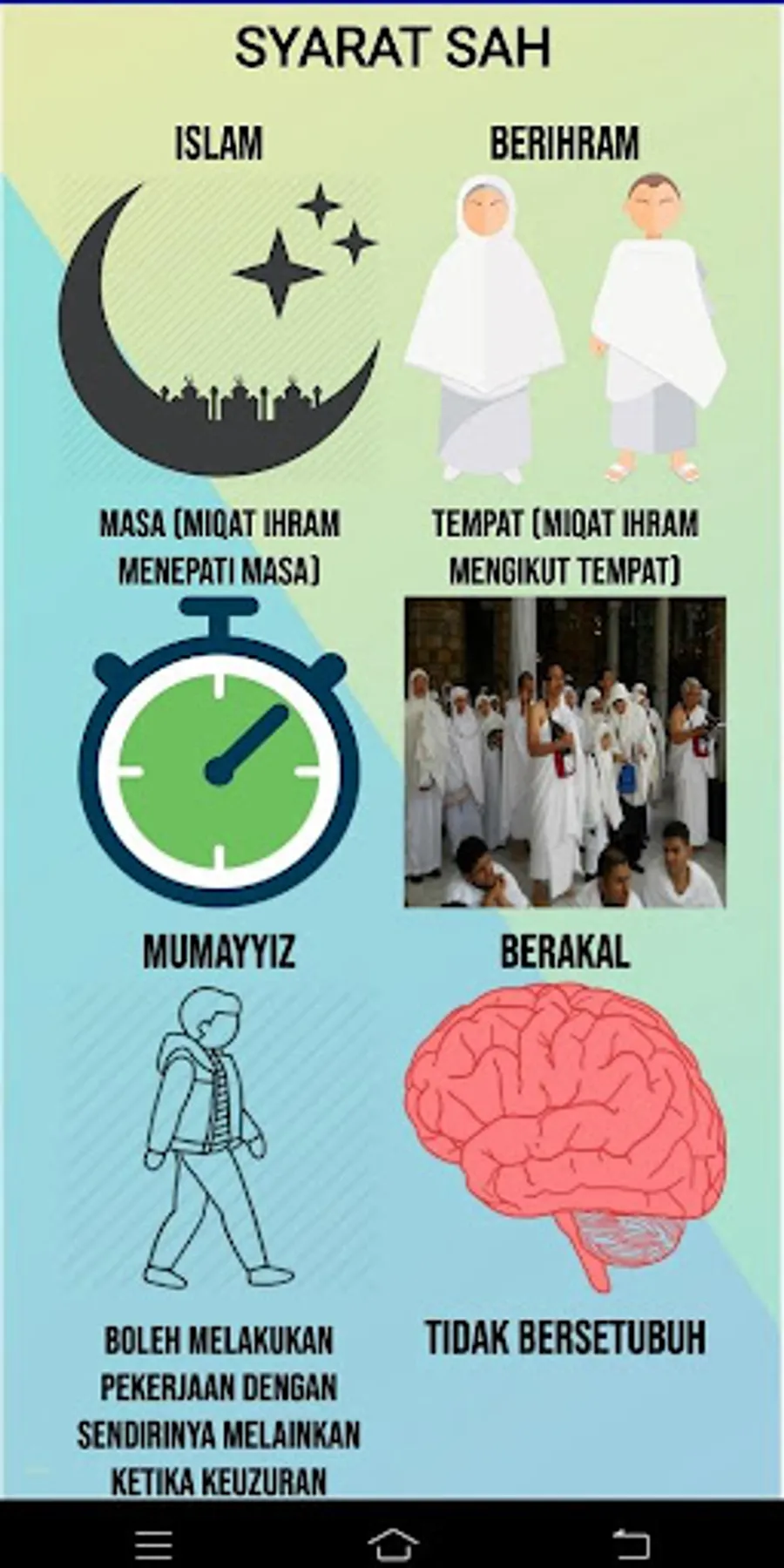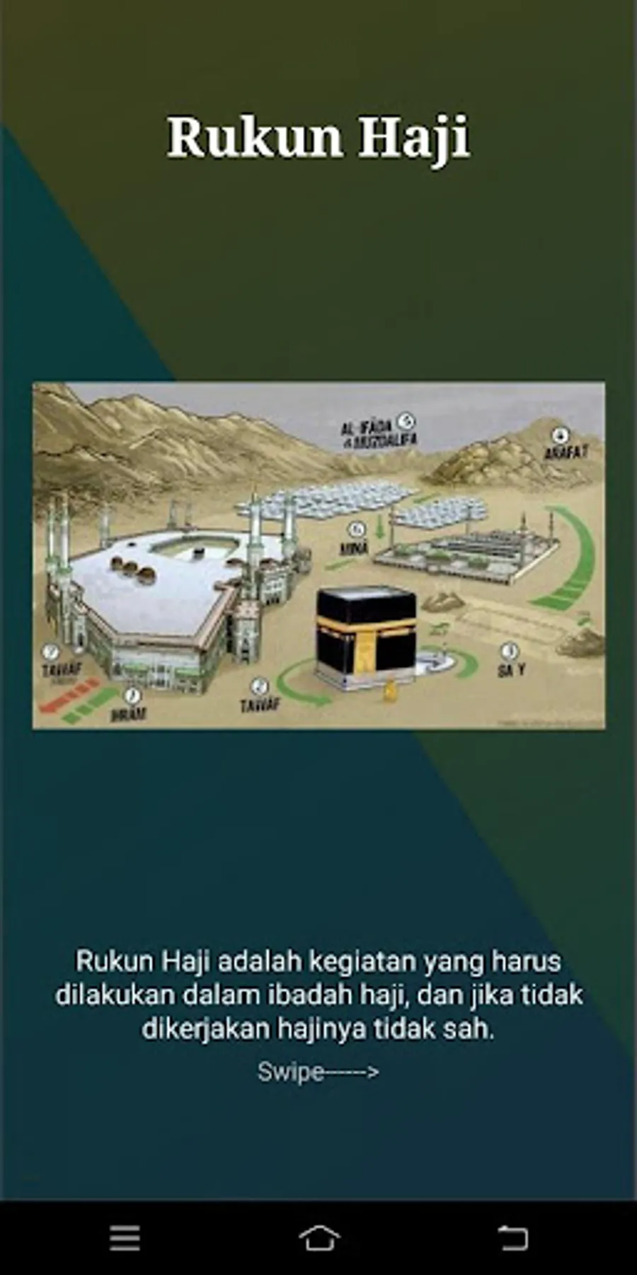 Aplikasi ini menerangkan dan memberi nota-nota mengenai cara melakukan haji, syarat sah, syarat wajib dan lain-lain.