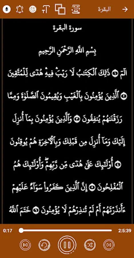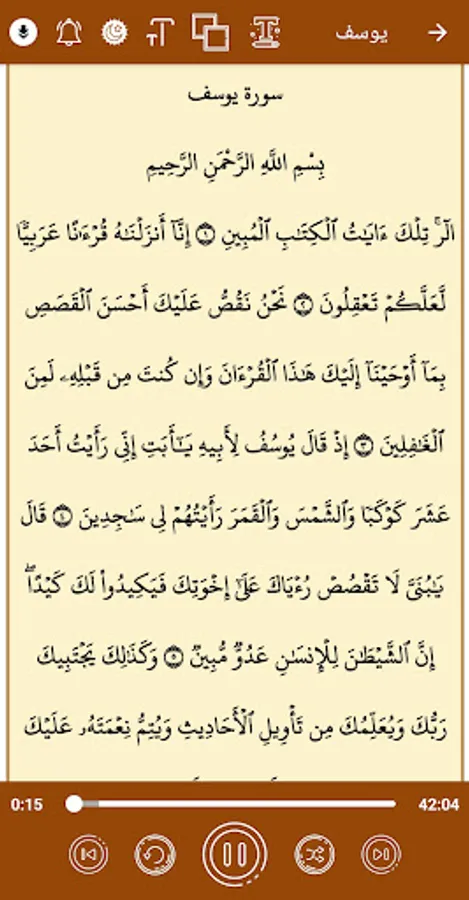 By pressing the (Next Surah) and (Previous Surah) button, you can listen to the previous surahs of the surah you are listening to, as well as the following surahs. The program also shows you the duration of each surah so that you are aware of this.
