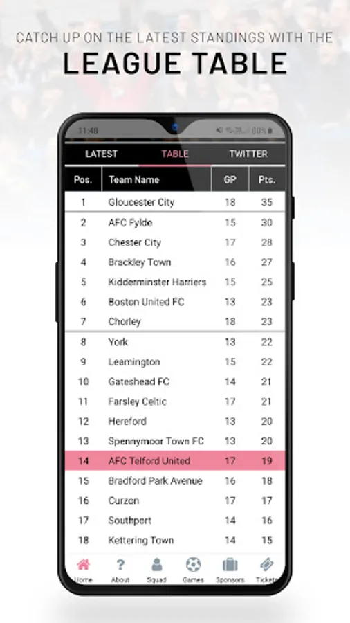 National League North standings and highlights Telford, showing the number of games played and points scored whilst the Twitter tab shows