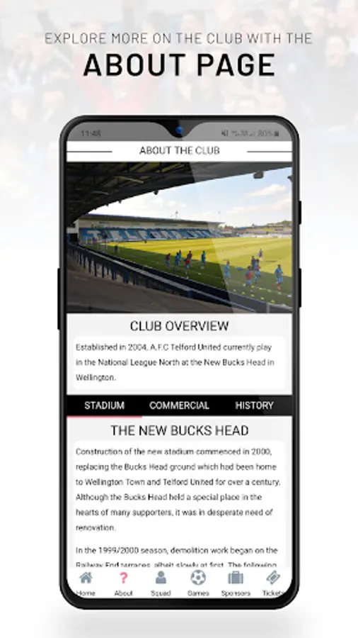 Separated into 3 tabs, this page acts as your guide to Telford United, the New Bucks Head and Hospitality. It showcases our club’s rich and
