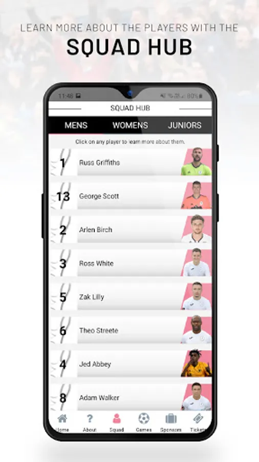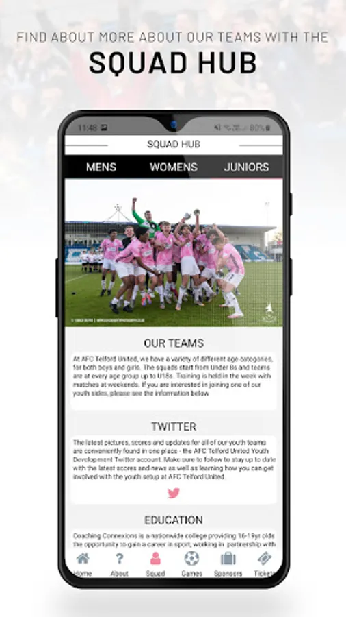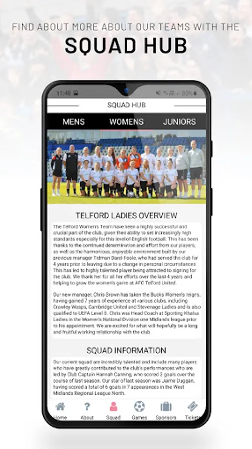 women's team, with detailed information on the team and current squad shown in the App as well, along with contact details for your chance to