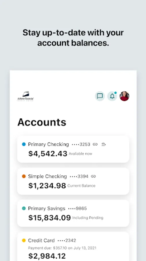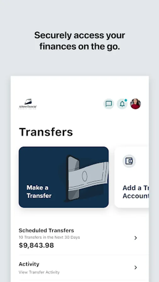 Achieve Financial Credit Union’s mobile app provides easy and secure access to your accounts. Easily check your balances, view transactions, make transfers, pay bills, or find nearby branch locations and surcharge-free ATMs. Achieve’s mobile app is available to all Achieve Financial Credit Union members.