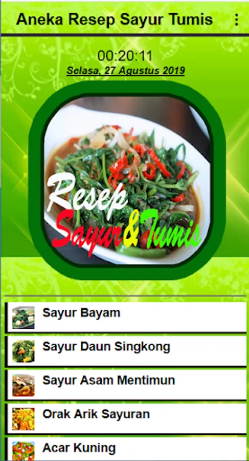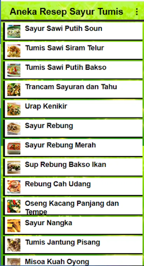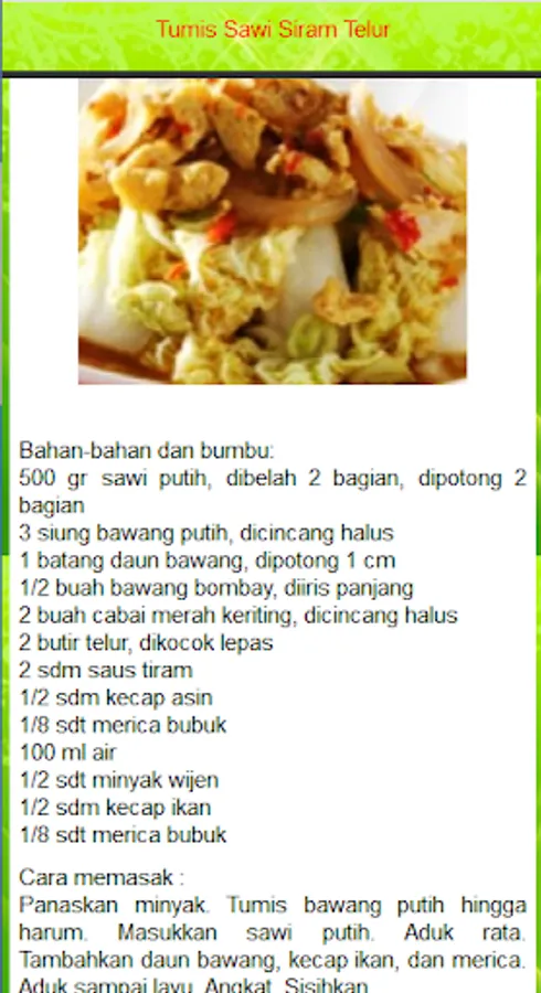 This vegetable and stir-fry recipe application is an OFFLINE application, which can be used without an internet connection, making it easier for you to use it. The following are some dishes that are served in the Vegetable and Saute Reep Book application: