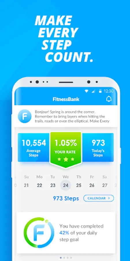 Take the first step. Start tracking with our FitnessBank Step Tracker. Set a goal. Create a group. Join a Challenge. Earn Bonus Steps — it’s all right here.