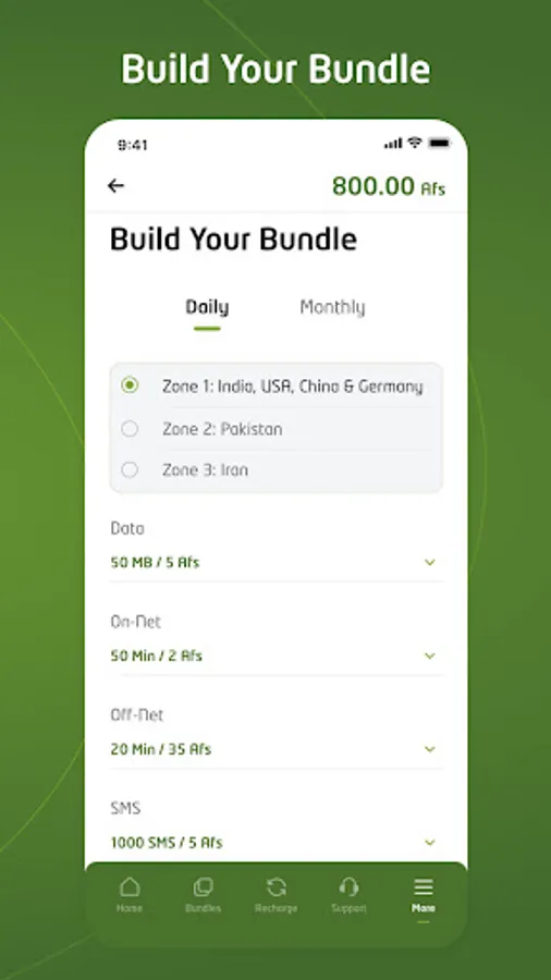 Build your bundle: customize your bundles and chose from daily and monthly data bundles, OnNet voice bundles, OffNet call bundles, SMS bundles, and international bundles.