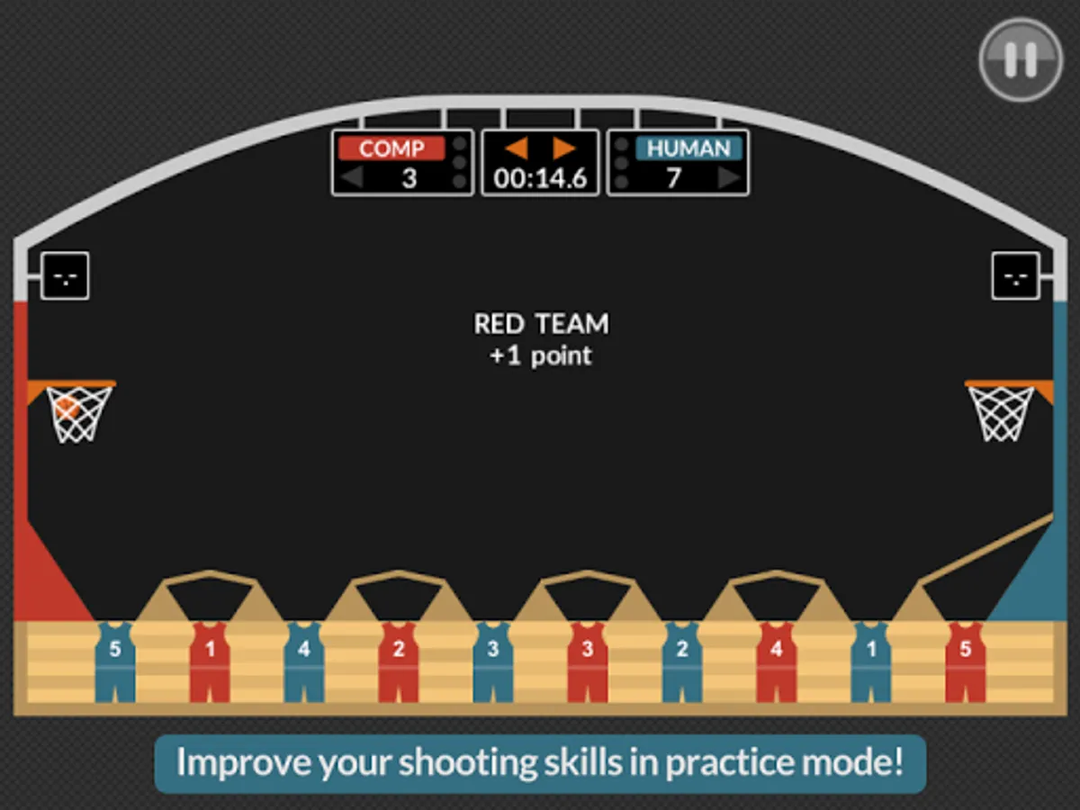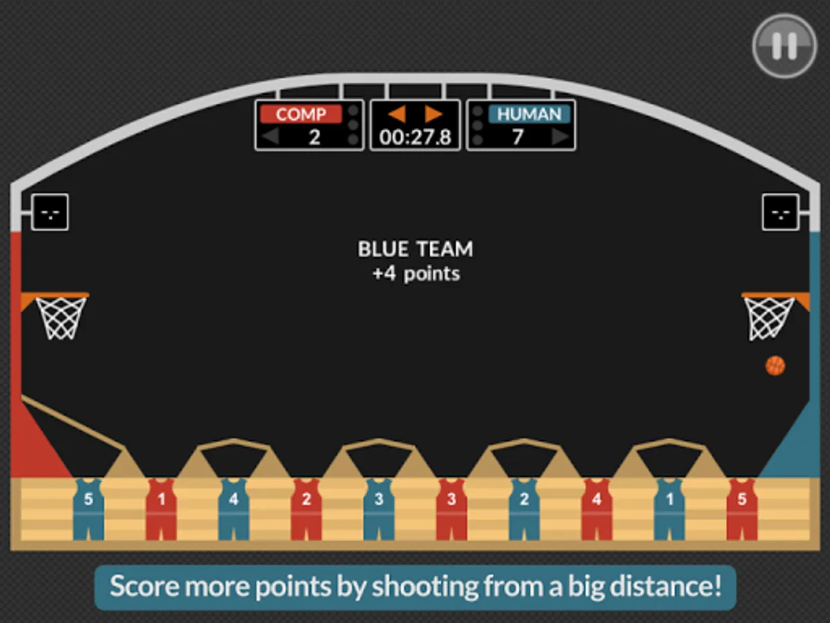 During the gameplay, a team can score from 1 to 5 points by shooting the ball through the basket net. Shots from a long distance worth more points! To know how much points could be scored, each player of the team has a number on its sport dress as follows: